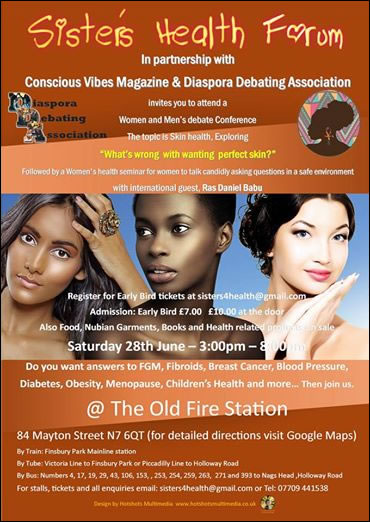 A seminar on womens health enabling participents to talk candidly and ask questions in a safe enviroment. Themes include skin health exploring topics like bleaching, with discussions on fibroids, blood pressure, diabetes, breast cancer, etc. With international guest, traditional African herbalist Ras Daniel Badu and debate hosted by In partnership with Conscious Vibes magazine and the Diaspora Debating Association. Anti-skin bleaching presentation by Toyin Agbetu.