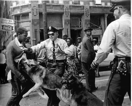 This famous image of William Gadsdan being attacked by police dogs is representative of the brutal tactics deployed by police officers to suppress non violent protests by African people